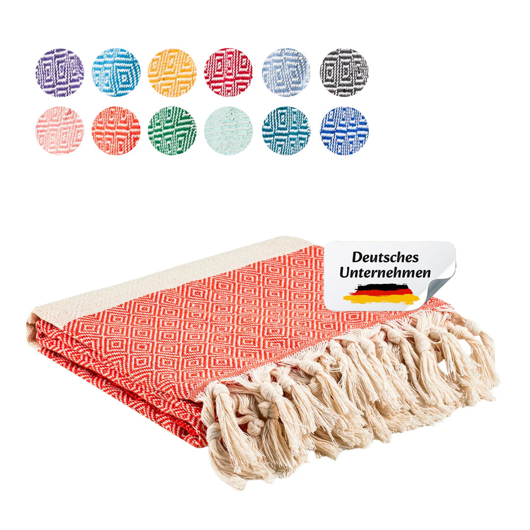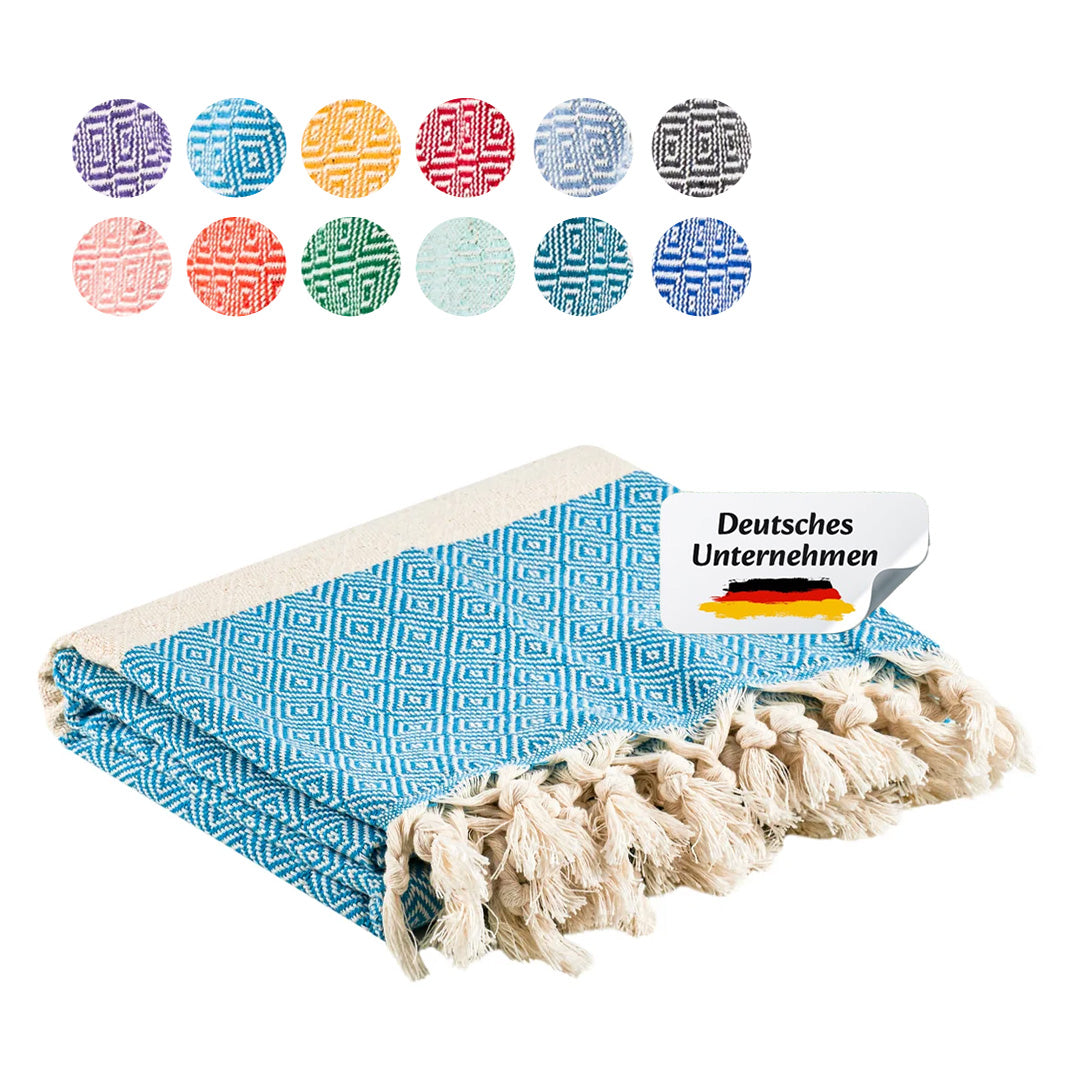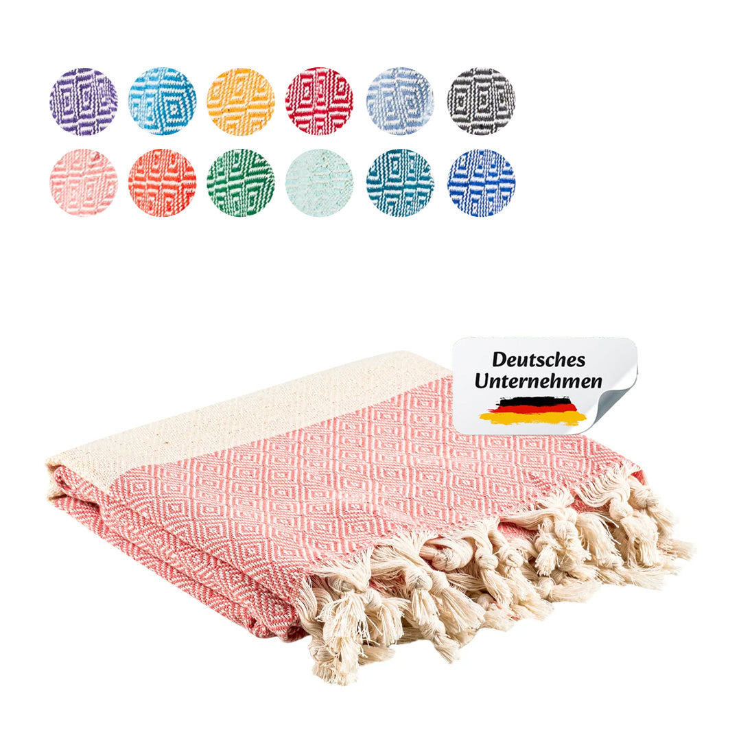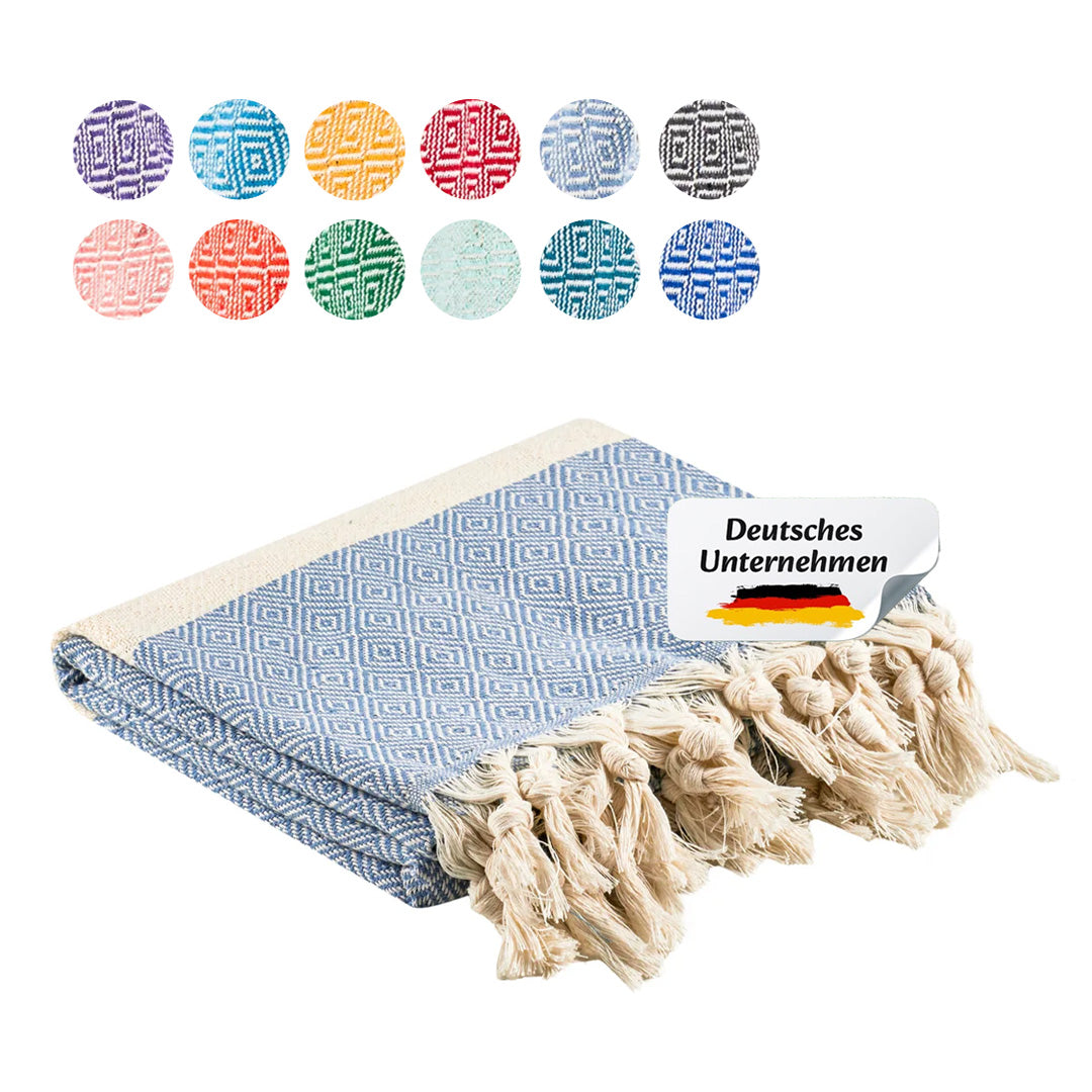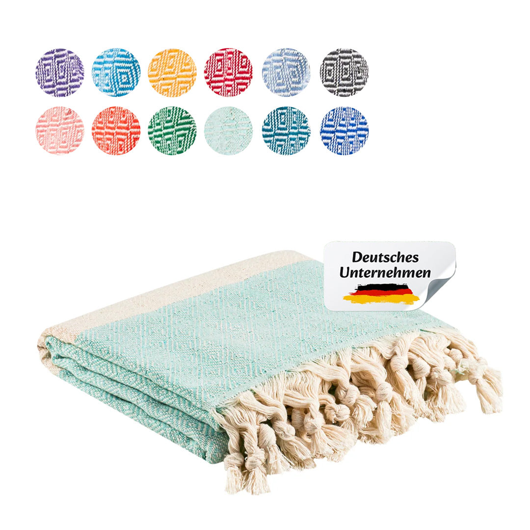 Unsere Strand- und Hamamtücher bestehen aus 100 % Baumwolle – das macht sie besonders angenehm auf der Haut, auch für empfindliche oder zu Allergien neigende Hauttypen.