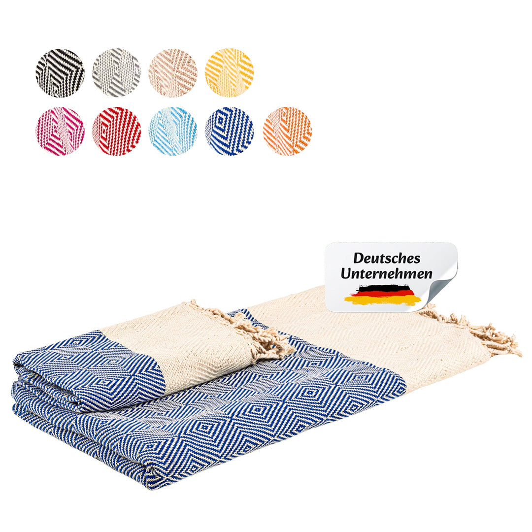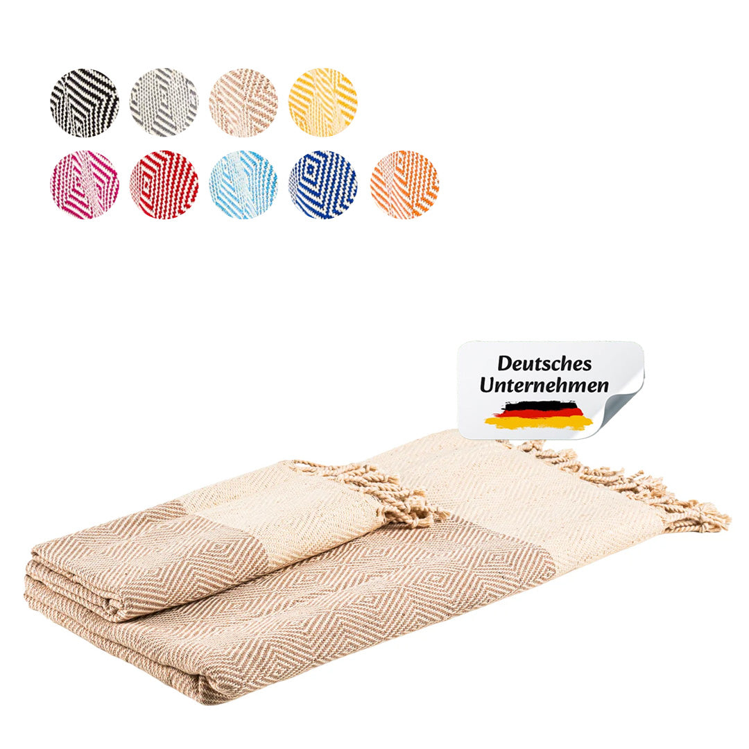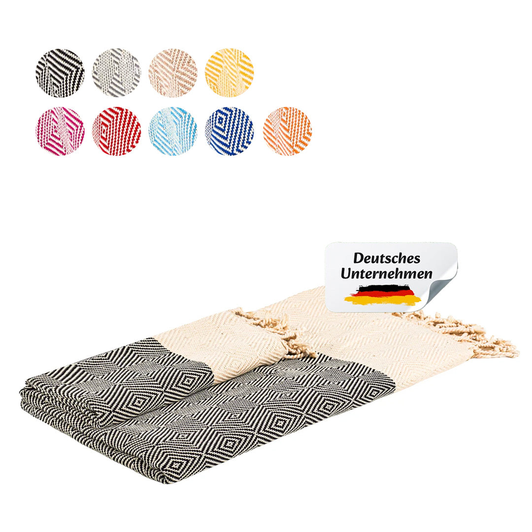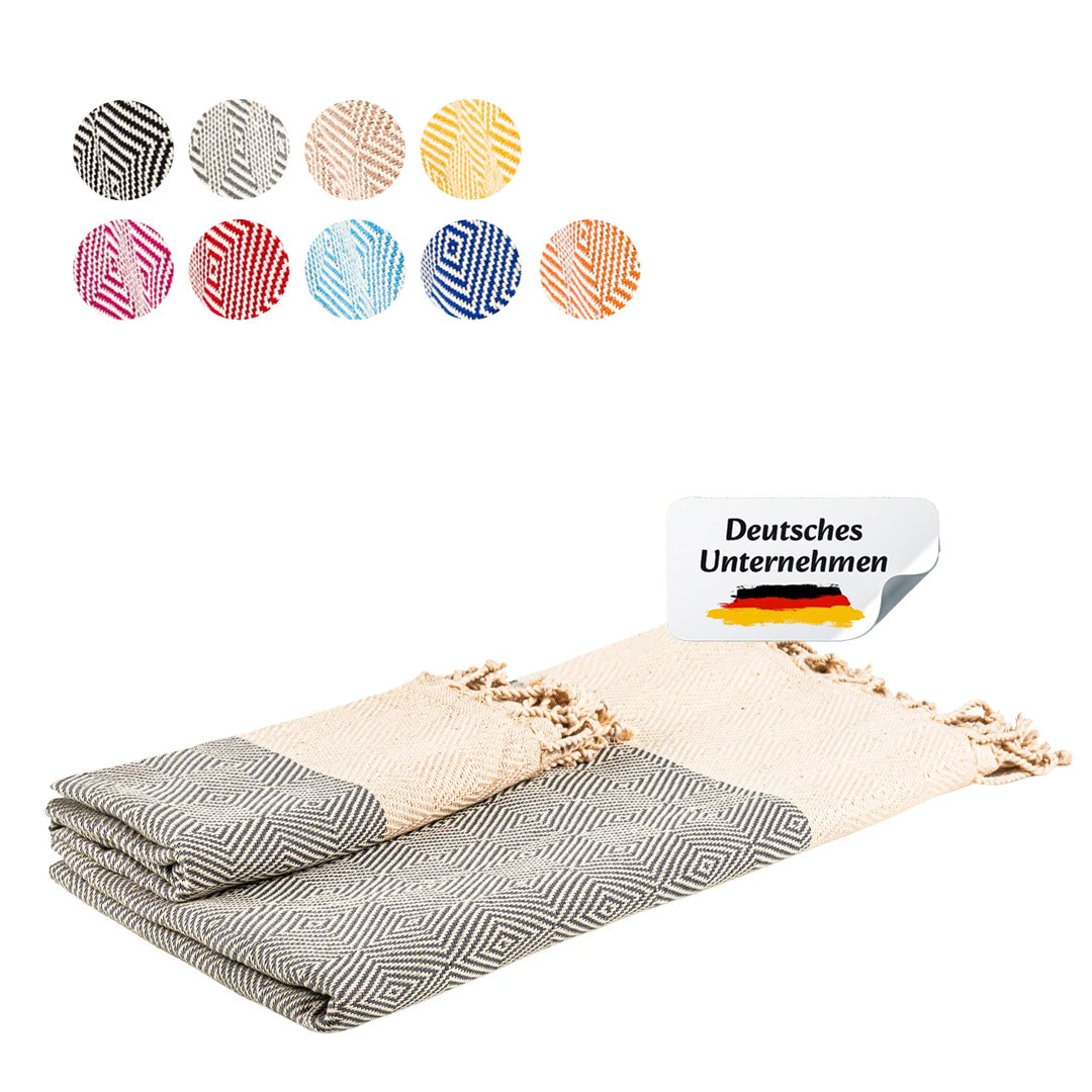 Unsere Strand- und Hamamtücher bestehen aus 100 % Baumwolle – das macht sie besonders angenehm auf der Haut, auch für empfindliche oder zu Allergien neigende Hauttypen.